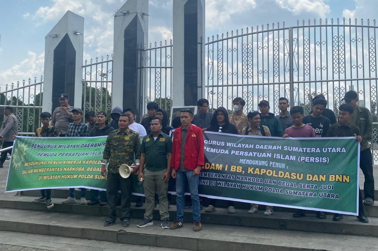 “Kami datang ke sini bukan untuk protes, tapi untuk memberi dukungan nyata kepada Kapolda Sumut dan jajarannya, Pangdam I/BB serta BNN Sumut. Mereka telah berjuang luar biasa dalam memberantas jaringan narkoba dan pelaku kejahatan lainnya,” tegas Amiruddin Siregar, S.H., selaku pimpinan aksi sekaligus Ketua Bidang Organisasi, Kepemudaan dan Olahraga PW Pemuda Persis Sumut.